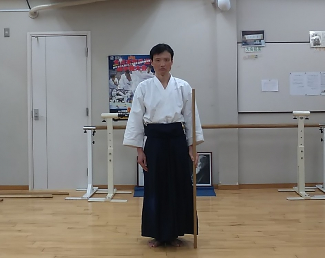 合氣道真生会では、先師が開祖(植芝盛平翁先生)より伝授された杖(じょう)の操法を一つの流れにまとめた「杖(じょう)の形」を稽古していますが、この形も体の横に杖(つえ)を自然に立てたような姿勢から始まります。武器の杖(じょう)と生活道具の杖(つえ)の関係を考えた時に興味深い符合であると感じます。