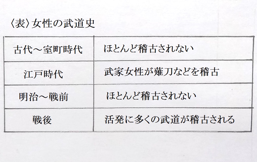 歴史的に見ると、古代~室町時代の頃までは平家物語の巴御前のようなごく一部の特例を除き女性はほとんど武術を稽古しなかったようです。今よりもはるかに「男性」と「女性」の役割が区別されていた時代において、合戦で戦うのは男性の仕事であるから女性に武術は必要ない、という考えが強かったのかもしれません。戦国時代までの武術は、平時の護身術としてより合戦での戦闘術としての意味が大きかったですから。実際には女性が集団的に戦闘参加していた事例も少なからずありますが、それは「居住地域が包囲攻撃された際の総力防衛戦」といった場合が多く、計画的な軍事行動に女性が戦力として組み込まれることはほぼありませんでした。