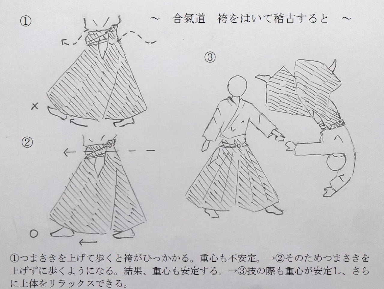 「足さばきを隠すため」と説明されることもありますが、他人の足さばきや重心の位置くらい稽古していれば袴の上からでも簡単にわかるようになるので思慮の浅い誤った説明です。合氣道開祖・植芝盛平翁先生はそんな小さい考え方はしなかったでしょう。そもそも指導者や有段者は手本を示して教えるべき立場ですから、それが「隠すため」に稽古で袴をはくのは明らかにおかしなことです。