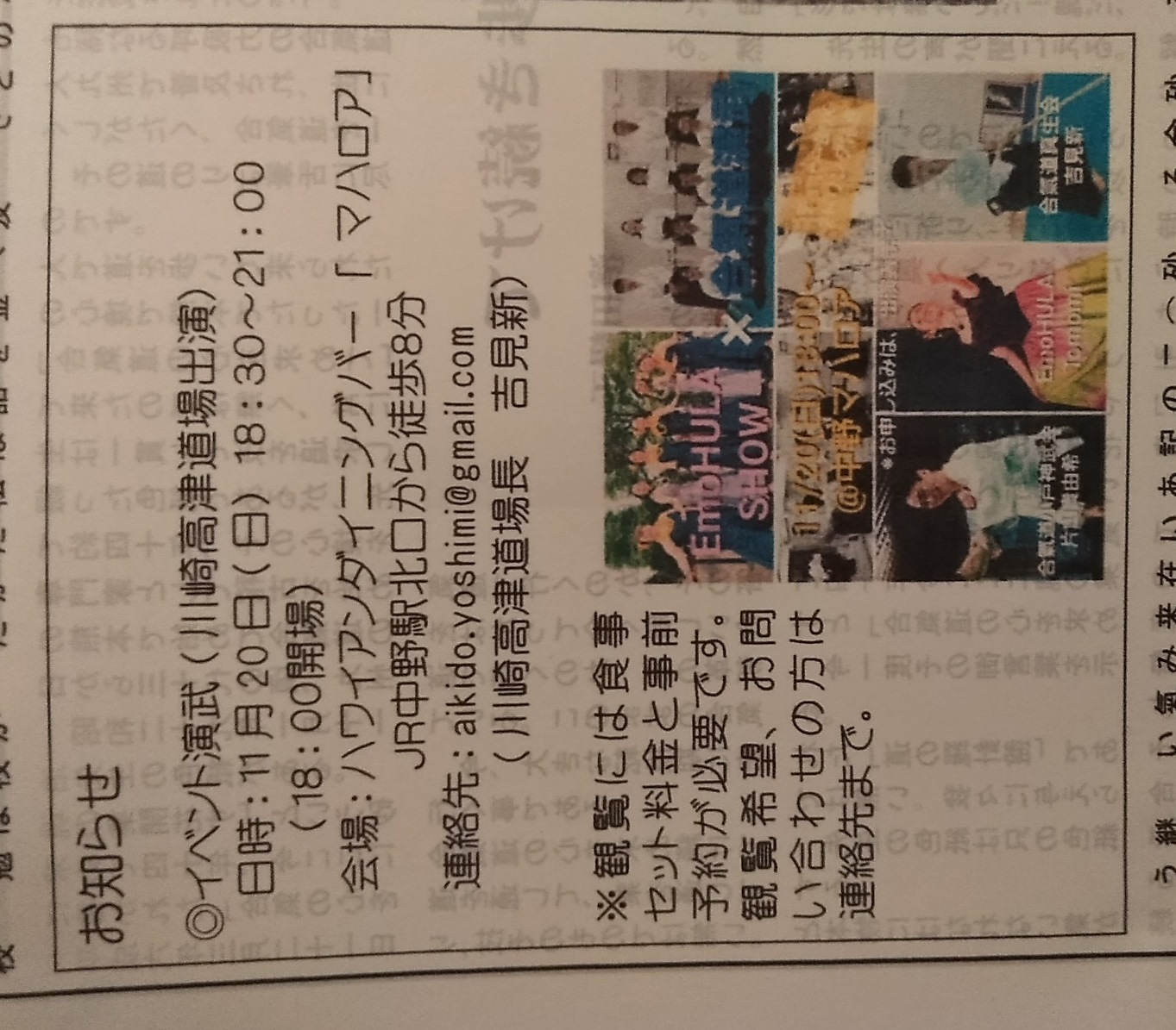 なお、昇級証書と一緒に送っていただいた合氣道真生報(本部より毎月発行)にも演武の告知が掲載されていました。自分は宣伝能力が皆無なのでとてもありがたいです。