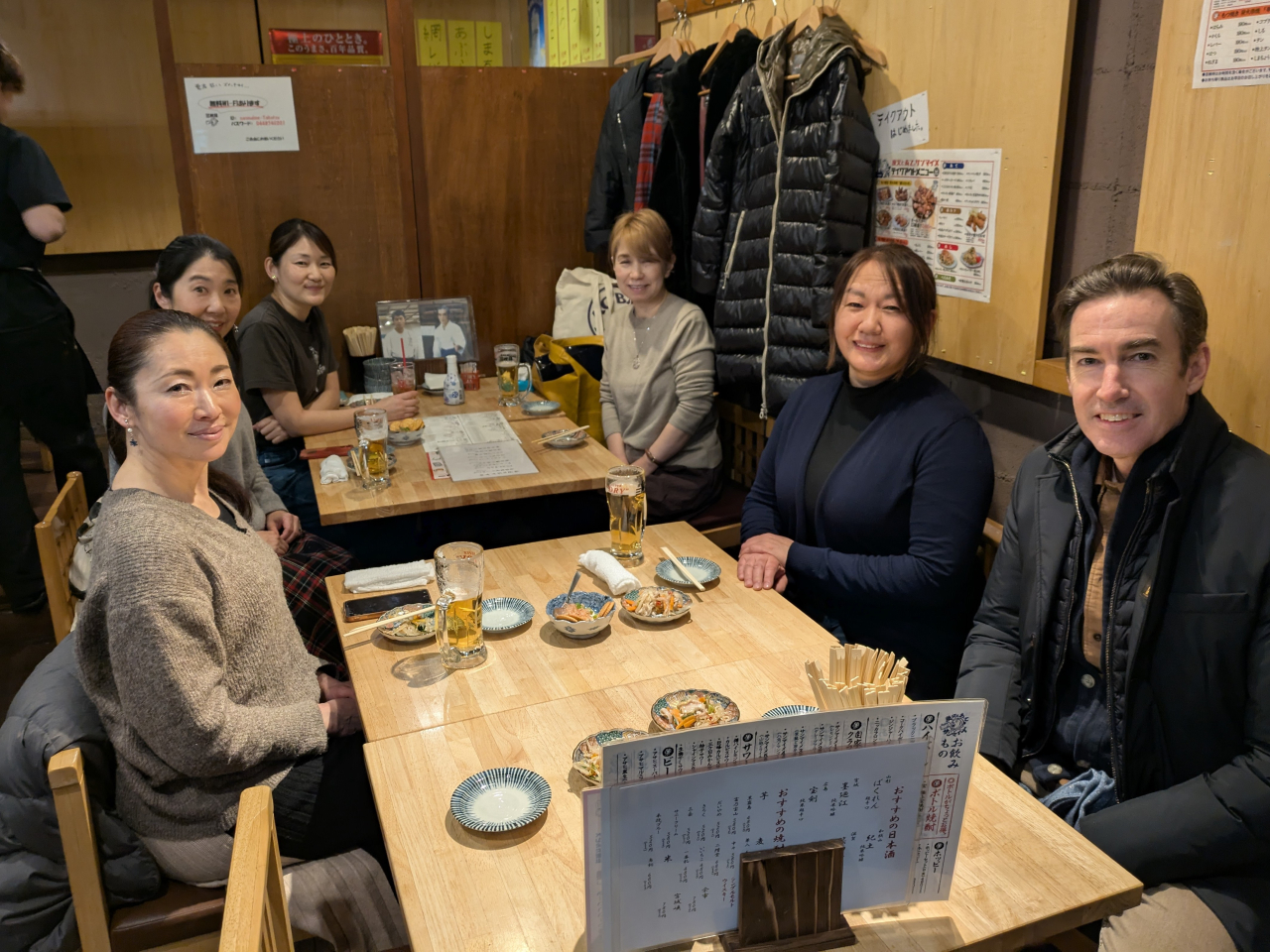 例によって予定の時間をだいぶオーバーし、バタバタと片付けて川崎高津道場の二代目公式イベント会場となりつつある高津駅前の居酒屋「サンマイメ」に席を移し、懇親会を開催しました。そしてこの懇親会には、自分のかつての稽古仲間であるアメリカ人のデニス=クラークさん(万生館合氣道三段)もご参加くださいました。デニスさんはアメリカで合氣道を始め、砂泊先生のことを知って1999年に来日し、熊本の万生館合氣道本部道場に入門、その後お仕事の都合で関東にいらしていた時期があり、自分とはその頃に一緒に稽古をした間柄でした。